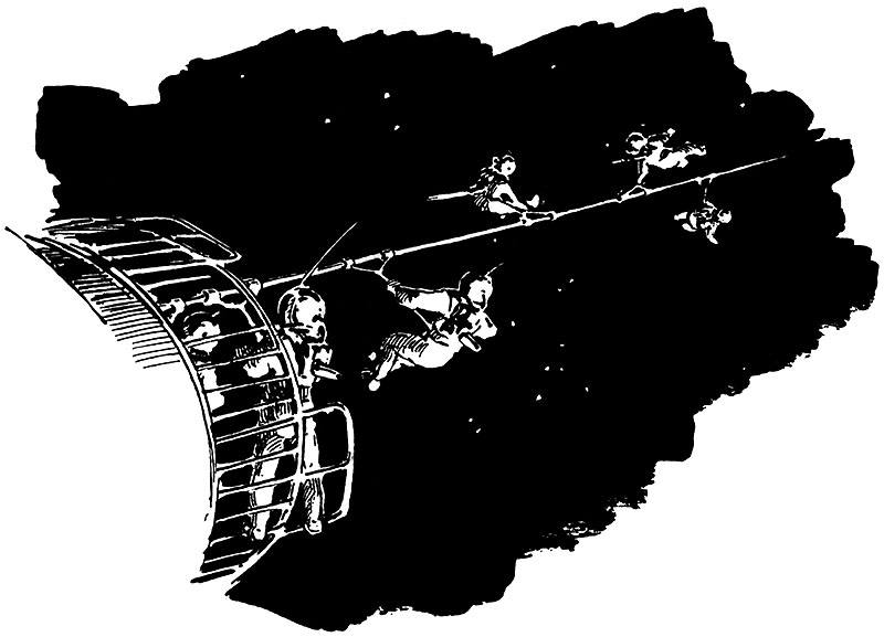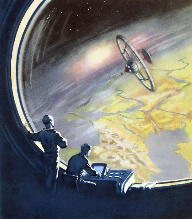 «Примерная конструкция искусственного спутника Земли. С такого спутника космические корабли будут отправляться в межпланетное пространство. Вращение спутника вокруг своей оси будет вызывать на нём искусственную тяжесть».