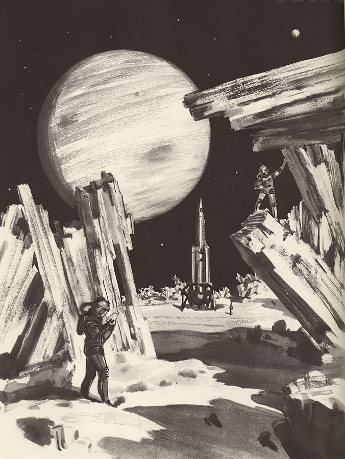 «...Мы на Плутоне. Солнце светит нам в спину, и лёгкая тень от корпуса гигантского корабля лежит на бесконечной сумрачной равнине, как дорога в неизвестное. Здесь границы солнечной системы. За ней, та, дальше, распростёрся бескрайний океан космического пространства. Но и его чёрную бездну пересекут когда-нибудь посланцы Земли, отправившиеся на разведку соседних звёзд»