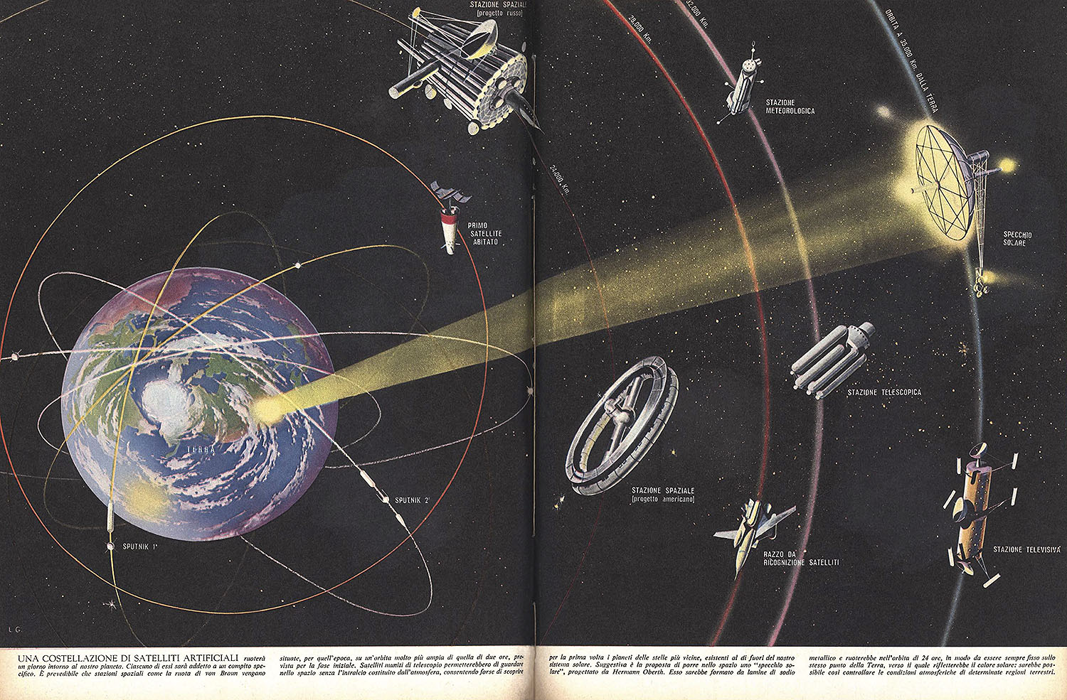 Позже эта же иллюстрация появилась в книге «История нашего друга Спутника». Вверху показан разворот второго издания (1960) книги. Поясняющий текст к рисунку: «В будущем, которое, вероятно, не очень далеко, вокруг Земли будет вращаться серия искусственных спутников, формы и размеры которых, а также расстояние от нашей планеты, будут различаться в зависимости от конкретных задач, поставленных перед каждым из них. Ожидается, что такие станции, как колесо фон Брауна, будут располагаться на гораздо большей орбите, чем двухчасовая орбита, ожидаемая на начальном этапе исследования. Спутники, оснащенные телескопом, позволят беспрепятственно наблюдать космическое пространство без помех от атмосферы: солнечное зеркало, разработанное Германом Обертом, вращается по орбите 24 часа; оно всегда будет оставаться неподвижным над той точкой Земли, куда оно будет отражать солнечное тепло, позволяя контролировать атмосферные условия определенных земных регионов».