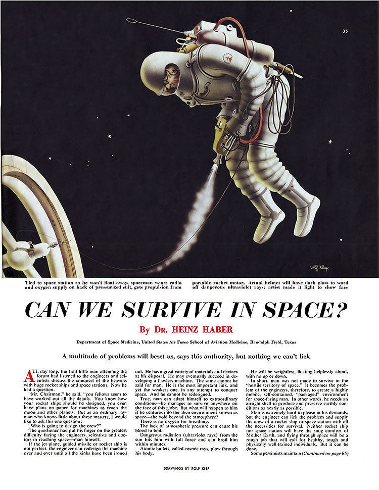 7 марта 1953 года в журнале «Collier′s» появилась очередная статья о будущем освоении космоса. Она называется «Испытание мужчин: Выживание человека в космосе». Подробно о ней я написал в своей статье «Мужская работа»: