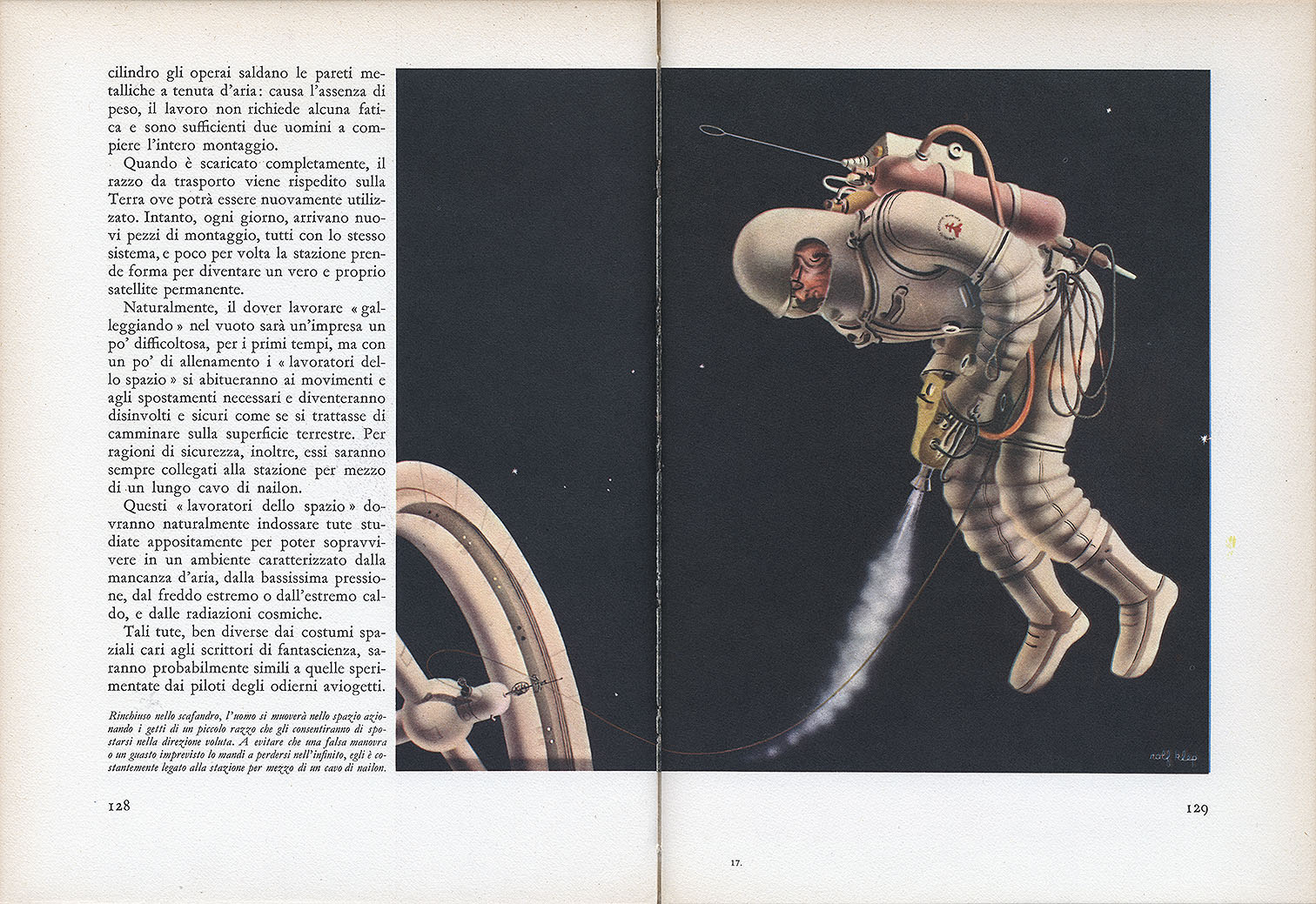 За несколько лет до публикации в книге, этот же рисунок космических кораблей над Луной появился в еженедельнике «Epoca». Вверху показана страница из выпуска 7 февраля 1953 года (№ 122). Пояснительная надпись к рисунку: «За тысячу километров до поверхности Луны космические корабли начинают посадочный маневр, управляемый ракетами. Посадка предусмотрена в районе, который древние астрономы поэтически называли «Sinus Roris», Залив Росы».