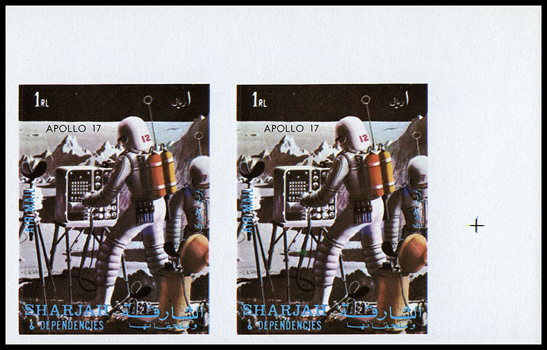 В 1972 году в Шардже выпущен почтовый блок (Michel block № 113), посвящённый лунной экспедиции «Аполлон–17». На поле блока воспроизведён рисунок из книги 1963 года. Выглядит блок ужасно: царапины на форме голубой краски, плохое сведение красок, особенно заметное на надписях, явно различим стык страниц на рисунке, отчего блок кажется мятым. Отвратительная полиграфия, характеризующая качество ливанской типографии «Imprimerie Yacoub Slim Press». Блоки традиционно выпущены с перфорацией, и без зубцов.