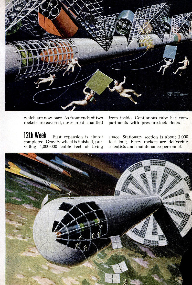 Одно из первых изображений проекта космического «бублика» фон Брауна появилось в начале 1950-х в американском еженедельнике «Collier′s». Вверху показан разворот выпуска 22 марта 1952 года, автор рисунка – американский художник Чесли Бонестелл.
