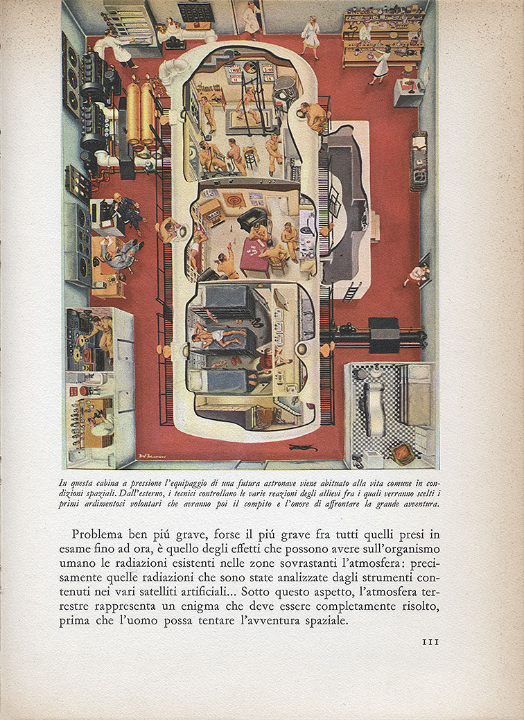 Этот же рисунок, только с надписями на итальянском языке, появился в еженедельнике «Epoca» 7 февраля 1953 года (№ 122). Пояснение к рисунку: «Для полёта на Луну будут использоваться два типа космических кораблей: грузовой и пассажирский. Первый с 10 человеками на борту, второй – с 20 человеками. Длина кораблей 50 метров, диаметр 34».