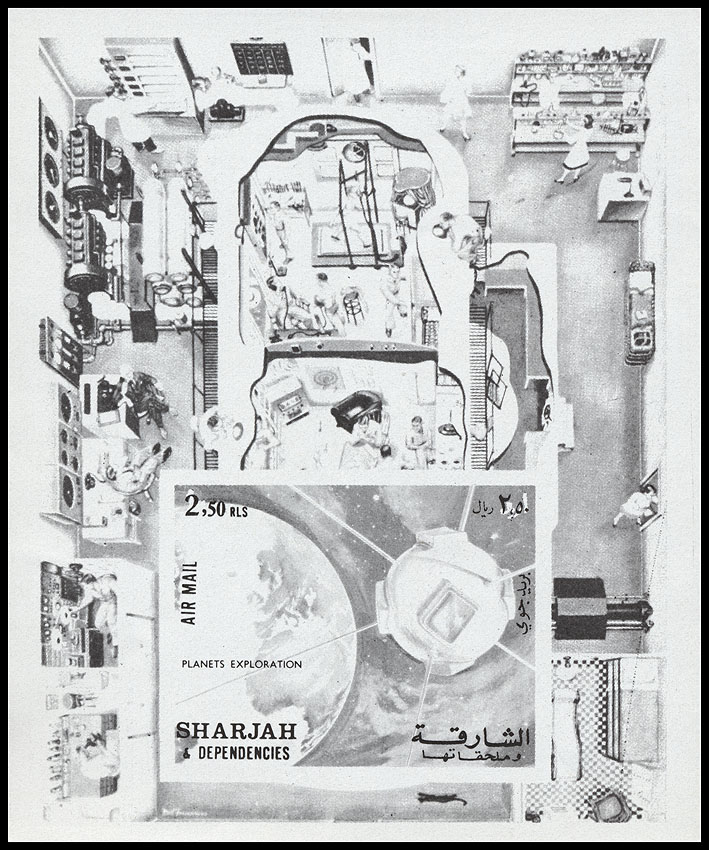 Ещё один блок Шарджи 1972 года (Michel block № 115) – на поле изображение герметичной кабины, где будущий экипаж космического корабля привыкает к жизни в космических условиях, а на марке блока – первый американский искусственный спутник «Авагард–1», запущенный 17 марта 1958 года. Блок изготовлен в ливанской типографии «Imprimerie Yacoub Slim Press» и выпущен в серии марок «Исследование планет».