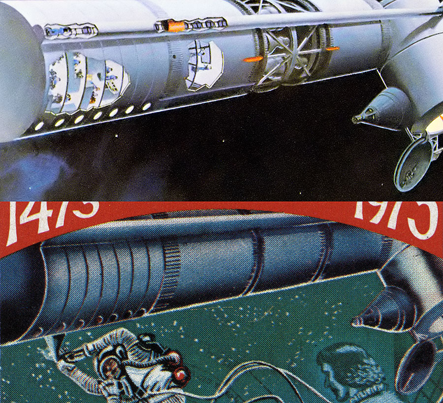 Но на самом деле на рисунке не драка, а неудачный коллаж из нескольких иллюстраций. Орбитальная станция позаимствована с иллюстрации к проекту космической станции США на сто человек (о ней я писал в статье «Крутятся, вертятся сто человек»).