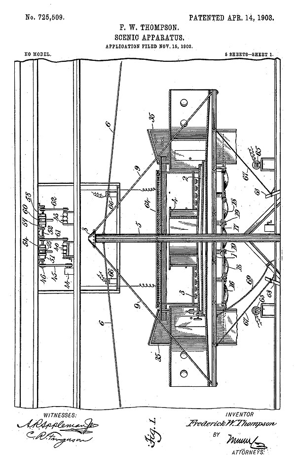 Очень интересен патент США № 725509, выданный создателю «Луны» 14 апреля 1903 года. Томпсон не поленился и запатентовал «сценический аппарат», которым, судя по описанию, являлся воздушный корабль «Луна». Возможно, по сравнению с конструкцией «Луны» Томпсон внёс в патент некоторые изменения, но общее техническое решение осталось прежним. Этот патент доступен, и любой желающий может с ним ознакомиться, я же дам его краткое изложение.