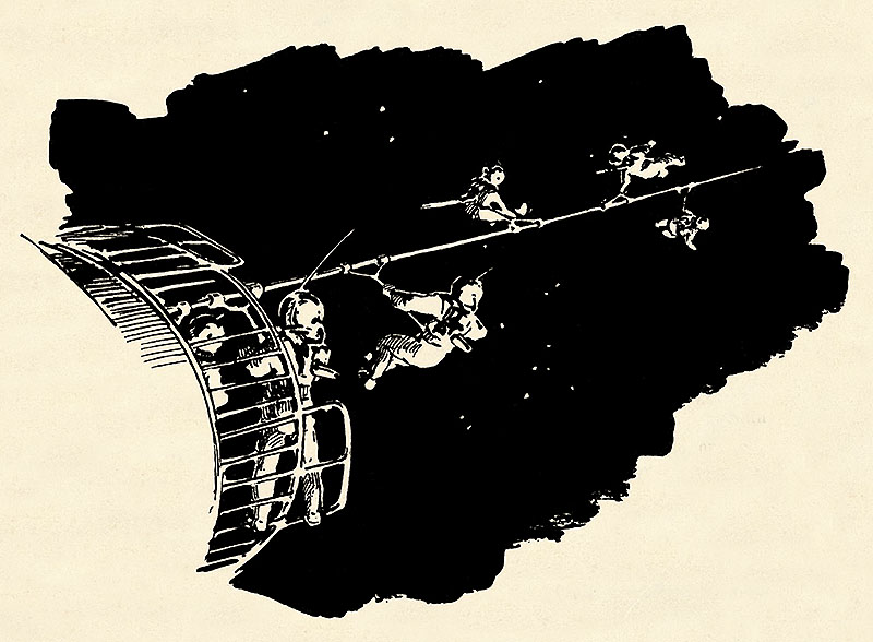 Нижняя часть космической станции позаимствована Викторовым с другой иллюстрации, появившейся на вклейке книги Бориса Ляпунова «Борьба за скорость» (М.: Молодая гвардия, 1952). Об этой космической станции можно прочитать в статье «Космические станции Ноордунга, Росса и Смита, Ляпунова, Ротрекла и «Международной книги».