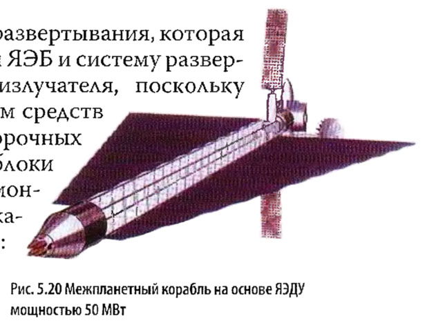 Рисунок экспедиционного комплекса для полёта к Марсу позаимствован из книги «Пилотируемая экспедиция на Марс» (Под ред. А. Коротеева. – М.: Российская академия космонавтики им. К. Э. Циолковского, 2006, 320 с.). Это иллюстрация к главе «Вариант электродвигательного комплекса на основе ядерных установок». Пояснительный текст к рисунку: «На рис. 5.20 представлен облик межпланетного корабля, энергодвигательный комплекс использует газотурбинный цикл с холодильником-излучателем, имеющим температуру около 650 K».