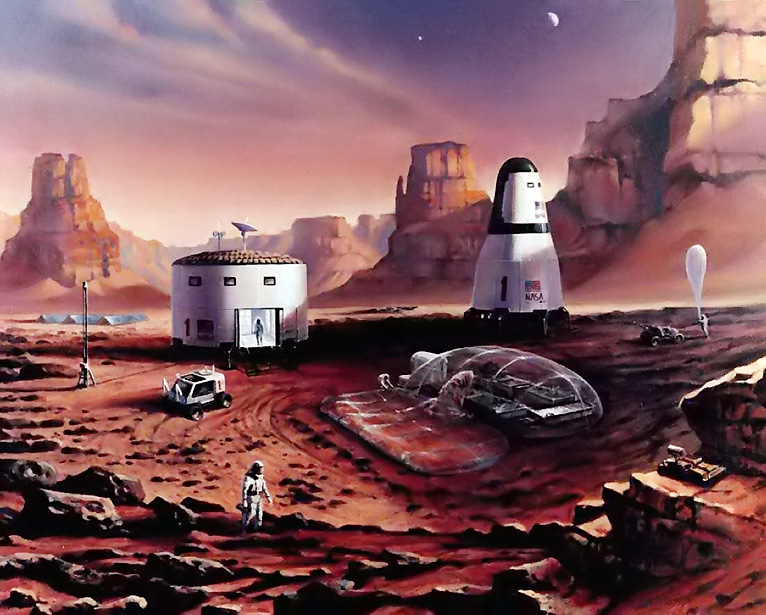 Вверху показано место базирования марсианской экспедиции: (1) – модуль перелёта к Земле; (2) – жилой модуль; (3) – удалённый ядерный реактор; (4) – оранжерея; (5) – герметичный вездеход с манипуляторами; (6) – солнечные батареи; (7) – открытый вездеход и астронавт, запускающий метеорологический зонд; (8) – роботизированное устройство для удалённых и опасных работ. Экипаж должен был провести на поверхности Марса 555 дней, что намного больше 30 дней, отведённых для исследования планеты в проектах «быстрых» миссий НАСА. После завершения работ, модуль перелёта к Земле заправляется топливом, произведённым из марсианской атмосферы. В течение восемнадцати месяцев, проведённых на Марсе, экипаж будет использовать наземные транспортные средства, с помощью которых сможет пройти 22000 км в пределах 500 км от базы. После полутора лет обширных научных исследований и изучения поверхности, астронавты перейдут в модуль перелёта к Земле и вернутся на Землю.