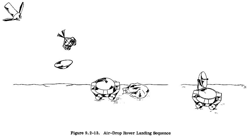 Ещё три возможные конструкции посадочного аппарата, предложенные в том же итоговом отчёте «General Electric». На первой иллюстрации последовательно показаны этапы посадки при скорости бокового ветра 200 футов в секунду и развёртывание посадочного аппарата. Тормозные ракеты неэффективны при большой скорости бокового ветра, поэтому было предложено поместить посадочный аппарат в надувной мешок. Во время посадки мешок станет своеобразной подушкой безопасности. После посадки посадочный аппарат покатится по поверхности, и остановится тогда, когда будет выпущен газ из мешка. После этого аппарат раскроется и установится в рабочее положение. На второй иллюстрации показан марсоход, который перед посадкой сбрасывается с аэродинамического теплозащитного экрана. На третьей иллюстрации марсоход доставляется на поверхность в посадочном аппарате.
