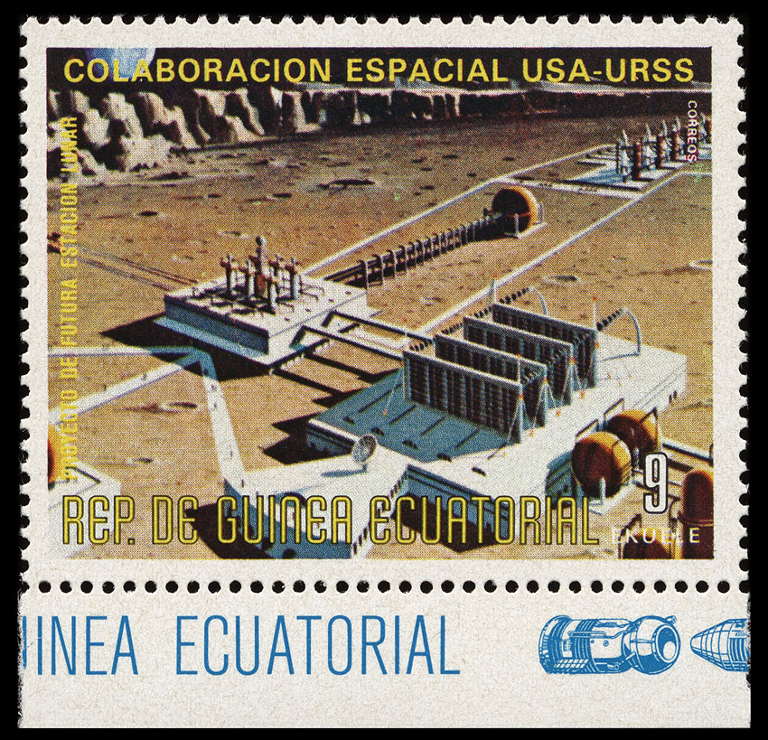20 июня 1975 года для Экваториальной Гвинеи выпущена серия марок «Космическое сотрудничество США-СССР». На марке номиналом 9 экуле (Michel № 594) изображён лунный автономный комплекс и космодром. На марке надпись: «Проект будущей космической станции». Марки выпущены в марочных листах 4x3, на полях листов изображения космических кораблей «Союз» и «Аполлон» и надписи «Космическое сотрудничество США-СССР» (вверху) и «Республика Экваториальная Гвинея» (внизу). Рисунки и надписи на полях напечатаны голубой краской.