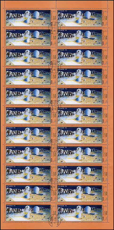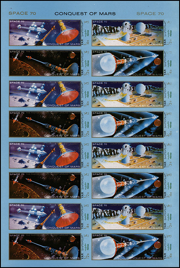 Работая над рисунками марок «Завоевание Марса», художник очень свободно переосмыслил иллюстрации других художников. Вверху показаны несколько разных марочных листов, в которых встречается марка с переосмысленным лунным комплексом. Некоторые листы настолько большие, что пришлось уменьшить их изображение по сравнению с другими марками.