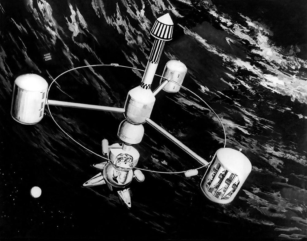 Судя по рисунку и описанию, в центре станции расположен главный модуль (1), соединённый длинным переходом с ядерным реактором (2). Под главным модулем находятся служебные помещения, лаборатории (4) и модуль (3) с несколькими стыковочными узлами. От главного модуля отходят три радиально направленные «руки»–перехода (6) с закреплёнными на концах модулями (5). В каждом модуле четыре этажа с лабораториями, подсобными и жилыми помещениями. Модули вращаются вокруг продольной оси станции, поэтому в них искусственная сила тяжести. Между модулями проложена круговая рельсовая дорога (7), по которой перемещаются закрытые транспортные тележки (8). Внизу видны два состыкованных шаттла (9), третий приближается к станции. В верхнем правом углу рисунка ещё один шаттл, он возвращается на Землю. В левом верхнем углу нарисован космический спутник (10).