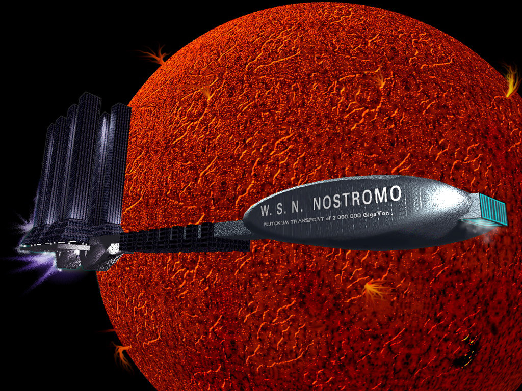 Под кораблём поясняющая надпись «Звёздные исследования», а на борту название корабля – «Ностромо», и «Плутониевый транспорт 2000000 Гт».