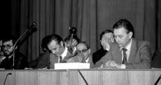 Вручение «Аэлиты». Фэны показывают шаржи на Зиновия Юрьева (Москва) и Владислава Крапивина (Свердловск). В президиуме (слева направо): ?, Владимир Гопман (Москва), Станислав Мешавкин (Свердловск), Сергей Павлов (Красноярск), ? (Архив: Коблов В. (Екатеринбург); Фото: Коблов В. (Екатеринбург); Обработано: Кузовлев И. А. (Екатеринбург), Зубакин Ю. Ю. (Челябинск))