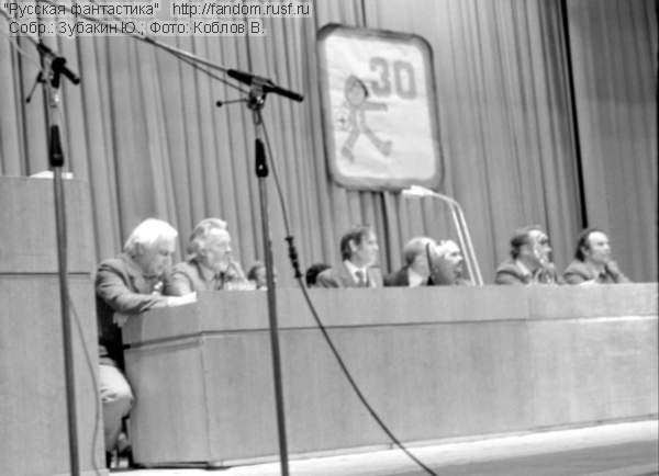 Просмотреть фото с наилучшим качеством Президиум (слева направо): Игорь Халымбаджа (Свердловск), ?, ?, Станислав Мешавкин (Свердловск), Давид Лившиц (Свердловск), Виктор Колупаев (Томск), Владислав Крапивин (Свердловск), Олег Поскрёбышев (Ижевск) (Архив: Коблов В. (Екатеринбург); Фото: Коблов В. (Екатеринбург); Обработано: Кузовлев И. А. (Екатеринбург), Зубакин Ю. Ю. (Челябинск))