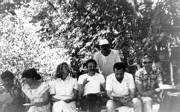 (слева направо): ?, ?, Ирина Игнатьева, Игорь Зубцов (Омск), Ираклий Вахтангишвили (Тбилиси), ?, ? Работает семинар. 1988, Дурмень. (Архив: Вахтангишвили И. (Киев); Фото: ?; Обработано: Васильев В. Н. (Москва))