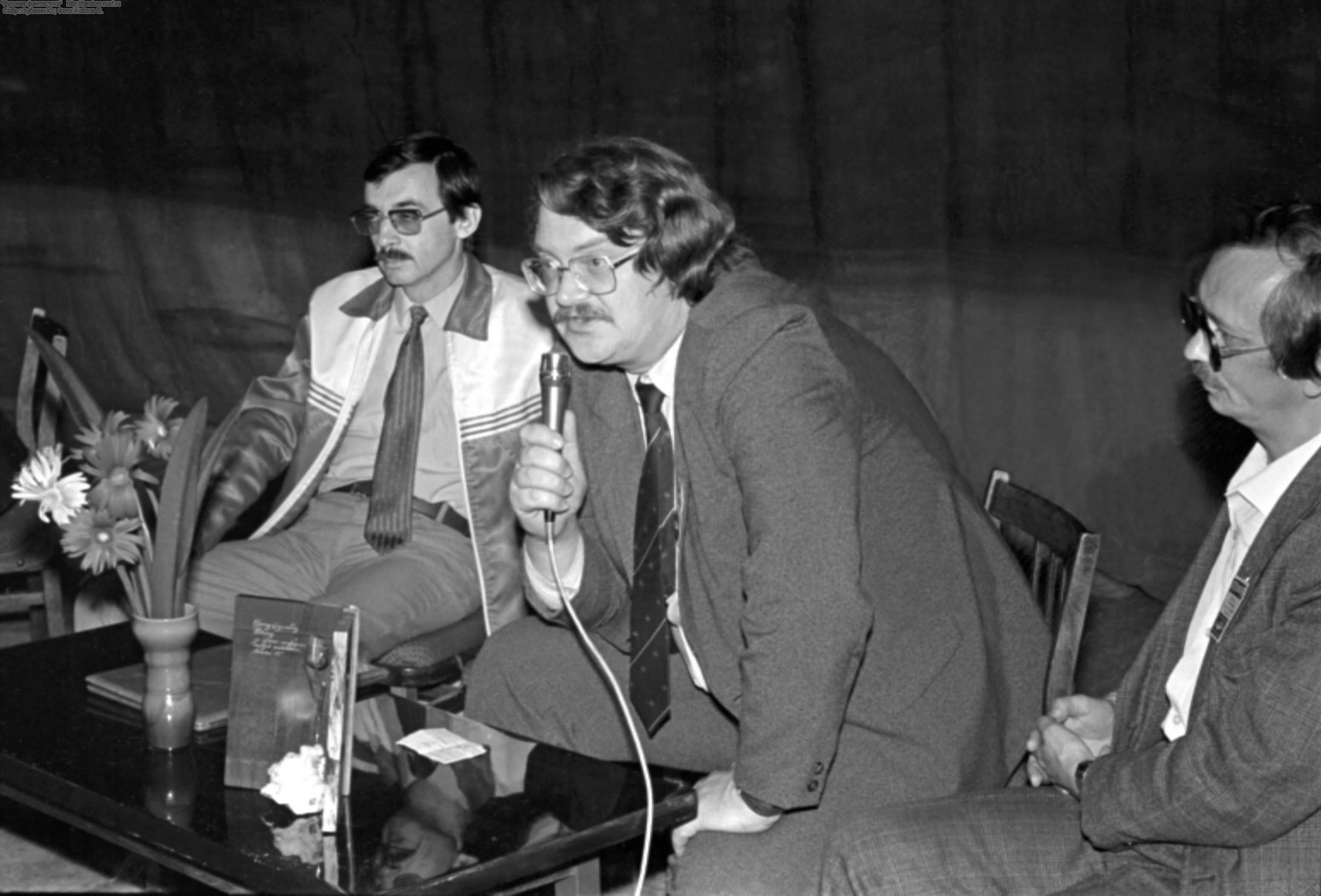 Выступает В. Бабенко (слева направо): Владимир Гопман (Москва), Виталий Бабенко (Москва), Сергей Казанцев (Свердловск) (Архив: Коблов В. (Екатеринбург); Фото: Коблов В. (Екатеринбург); Обработано: Кузовлев И. А. (Екатеринбург), Зубакин Ю. Ю. (Челябинск))