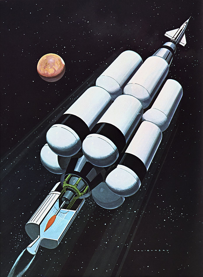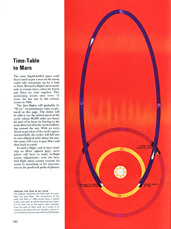 Тот же космический корабль на жидком топливе, который используется для доставки человека на Луну, мог бы доставить астронавтов на Марс. Но такой полёт возможен только в определённые моменты времени, когда Земля и Марс находятся близко друг к другу. Такое расположение происходит раз в 15 лет, последнее в этом столетии произойдёт в 1986 году.
