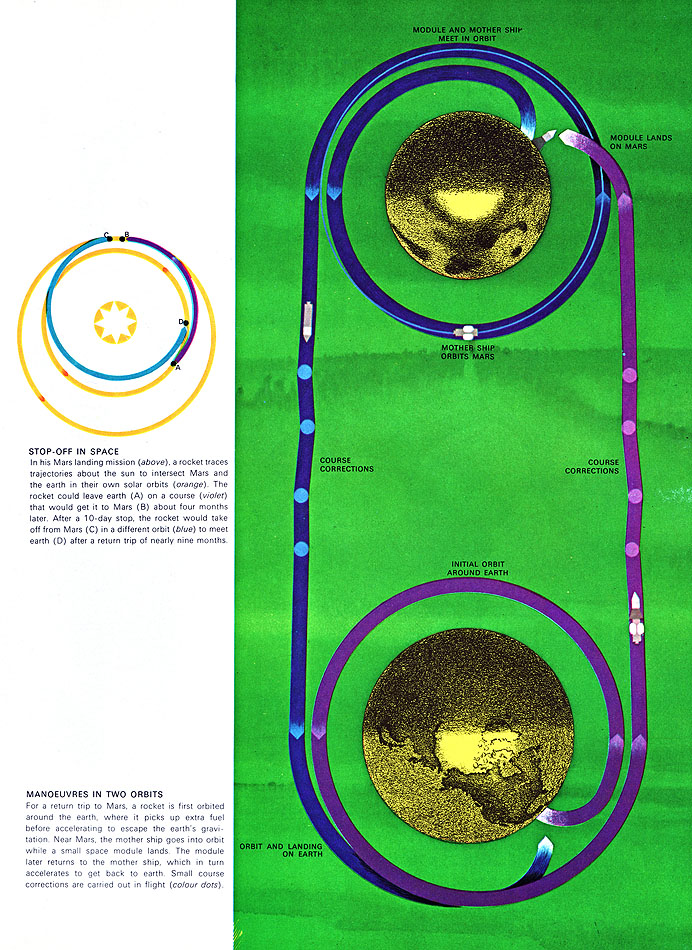 Для возвращения к Марсу ракета сначала совершает оборот вокруг Земли, где она получает дополнительное топливо, а затем ускоряется, чтобы преодолеть гравитацию Земли. Вблизи Марса базовый корабль выходит на орбиту, а небольшой космический модуль приземляется. Затем модуль возвращается на базовый корабль, который, в свою очередь, ускоряется для возвращения на Землю. Небольшие корректировки курса производятся в полёте (цветные точки)».
