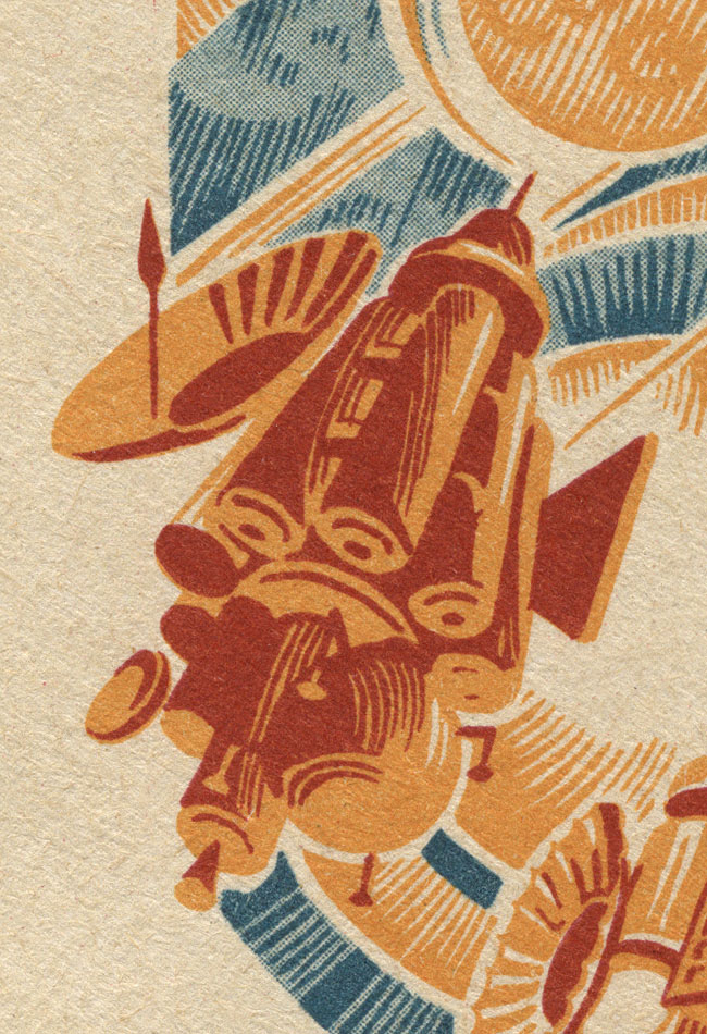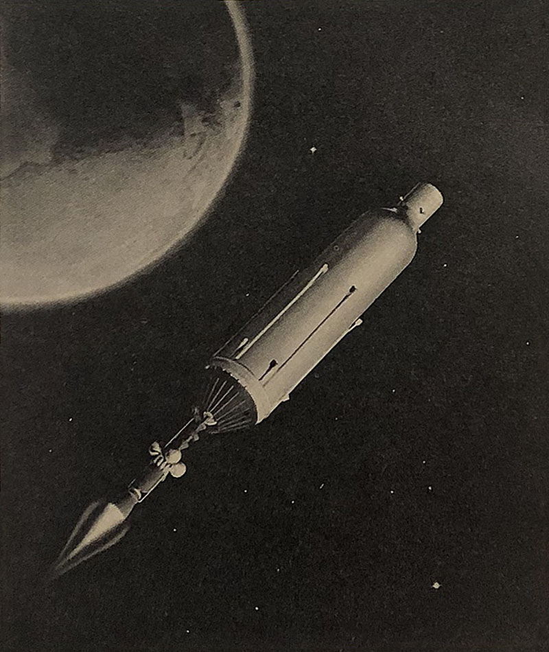 А вот с верхним космическим аппаратом не так всё просто. Судя по орбитам и красному цвету планеты с ледовой шапкой, аппарат направляется к Марсу. Но на АМС «Марс» этот аппарат не похож у него ядерный двигатель и он опоясан цилиндрическими баками с топливом. В нижней части, рядом с двигателем, изображён сферический спускаемый аппарат с четырьмя посадочными опорами. Его расположение нелогично и можно отнести только к фантазии художника. Верхняя часть космического аппарата тоже напоминает спускаемый аппарат, но другой формы. Также на аппарате расположена панель солнечных батарей и две параболические антенны. По всей видимости, этот аппарат вольная фантазия художника, символизирующая будущие исследование Марса. В рисунке угадываются как элементы АМС «Марс» (параболическая антенна, панель солнечных батарей), так и влияние рисунка Эда Валигурски (ядерная двигательная установка, опоясывающие цилиндрические баки с топливом, спускаемый аппарат в верхней части).