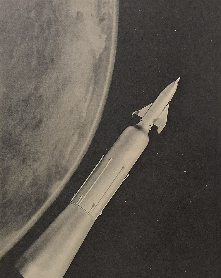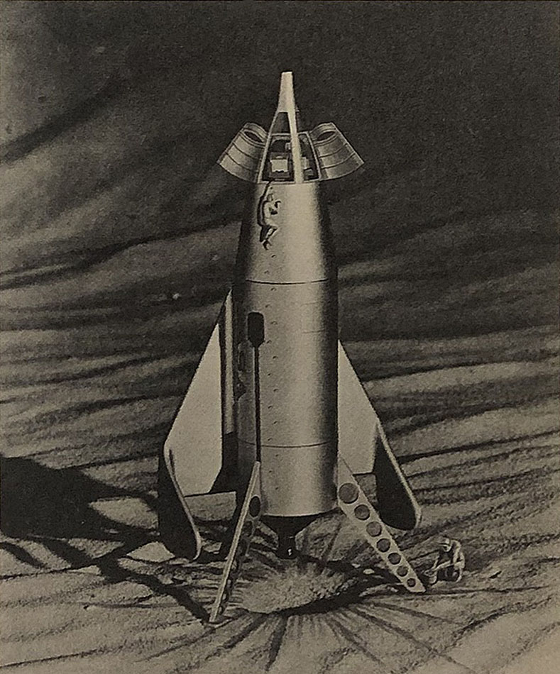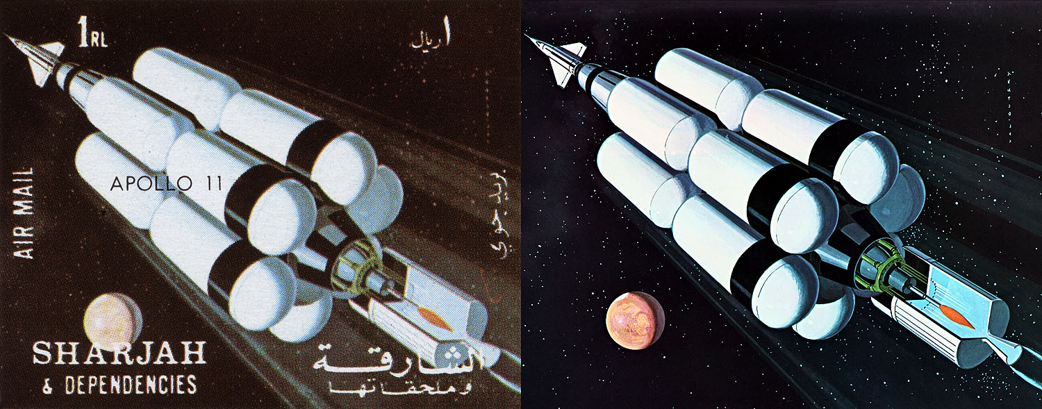 На одной из марок изображён знакомый космический корабль. Надпись на марке: «Направляющаяся на Марс ракета». По сравнению с оригинальным рисунком Эда Валигурски, корабль показан целиком, без разреза ядерного двигателя.