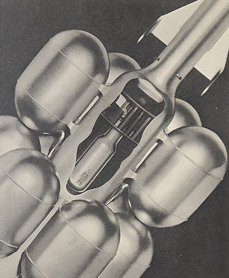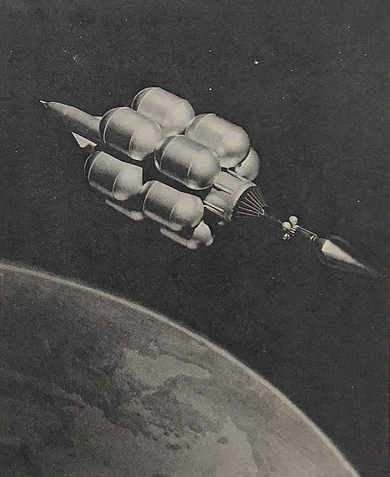 Показана система аппарата, типичная для полетов на Марс и обратно. Аппарат состоит из длинного центрального бака, окруженного двумя группами баков меньшего размера. Над ними расположена кабина, или жилой отсек, в котором находится экранированное хранилище. Над ней расположены два аппарата для входа в атмосферу. Один ядерный ракетный двигатель с удельным импульсом 900 с крепится к днищу центрального бака и используется во всех основных периодах движения. Это предполагает возможность повторного запуска двигателя, что представляется вполне осуществимым, поскольку период между запусками составляет не менее 40 дней.