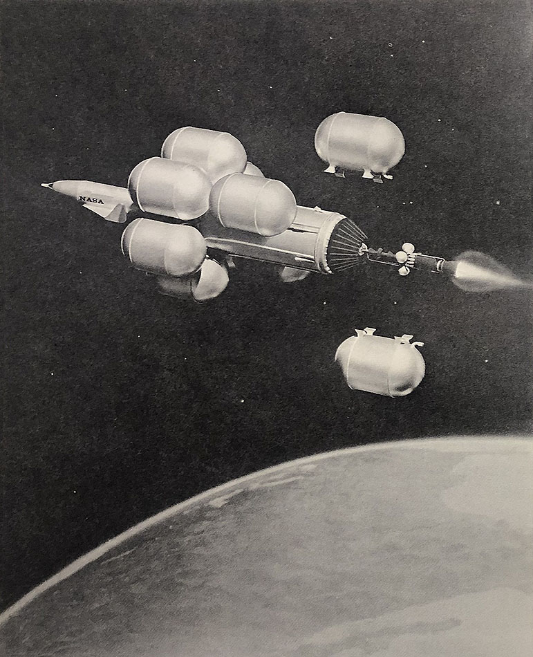 «На этой иллюстрации, отдельные водородные баки крепятся к двигательному модулю на низкой околоземной орбите. Каждый бак изолирован многослойной фольгой, защищающей от излучения, для минимизации испарения водорода. Кроме того, для баков, которые будут опорожнены только на более поздних этапах миссии, может быть использована система криогенной реконденсации. Эта система будет работать от ядерной электрогенерирующей системы типа SNAP-9 или SNAP-50, расположенной между главным реактором двигателя и кормовой частью центрального бака. Радиатор силовой установки SNAP находится сразу за баком. На практике может потребоваться перемещение этого радиатора в положение, значительно ближе к задней части ракетного двигателя, во время движения по инерции, чтобы минимизировать нагрузку на водородный бак. Существует заманчивая возможность отказаться от вспомогательного энергетического реактора путем интеграции жидкометаллического теплообмена с активной зоной ракетного реактора. Такой подход не только снижает вес системы, но и позволяет минимизировать проблему отвода остаточного тепла от двигателя».