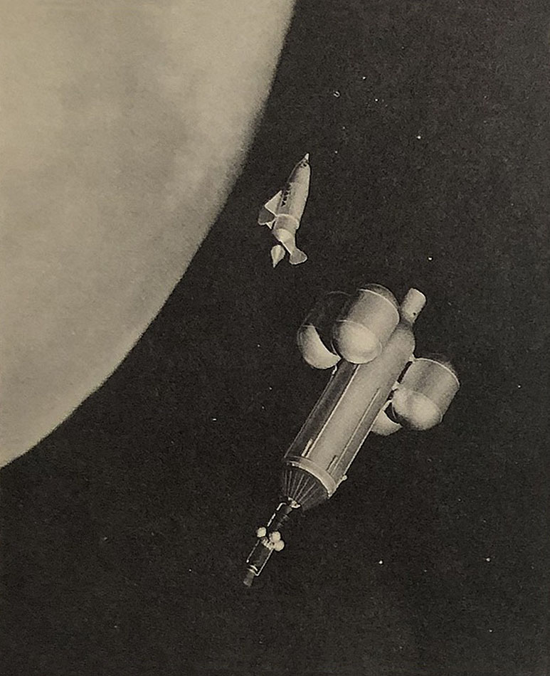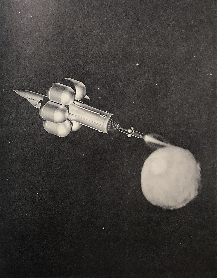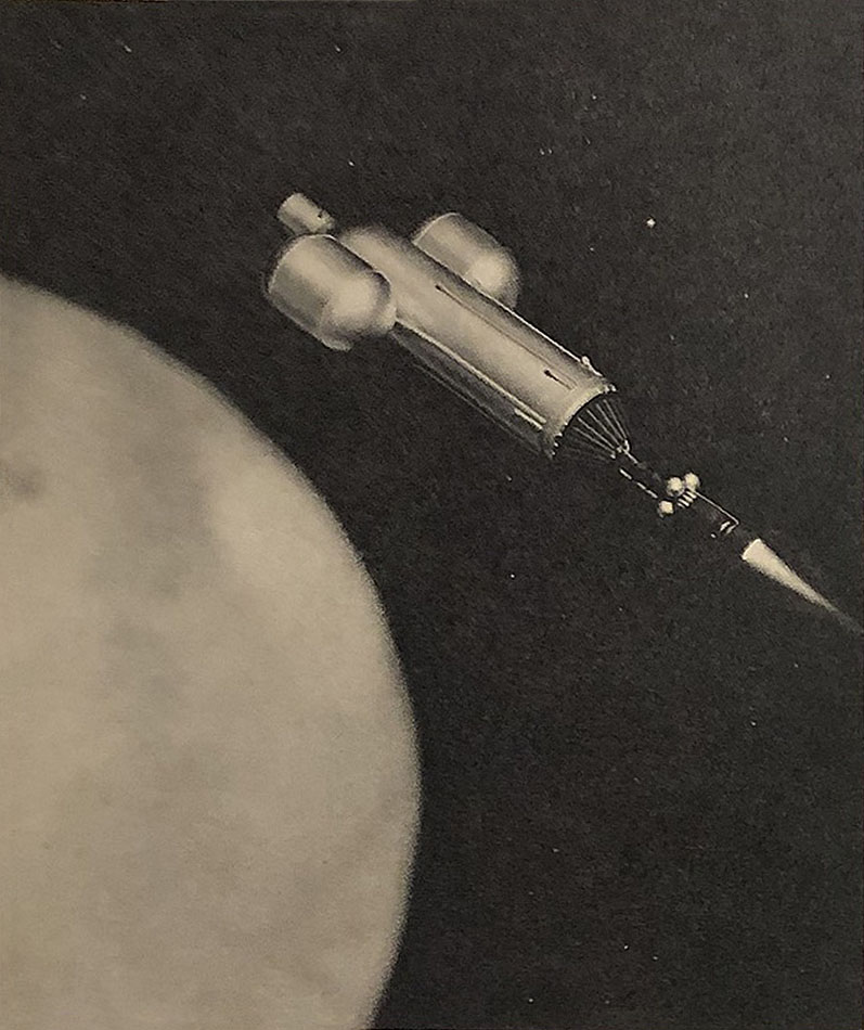 Рисунок поясняет принцип работы ядерного двигателя NERVA, показаннного в разрезе. А космический корабль позаимствован из концепта «General Electric» 1963 года. Также на рисунке изображён Марс, как цель путешествия. Пояснительный текст из книги: