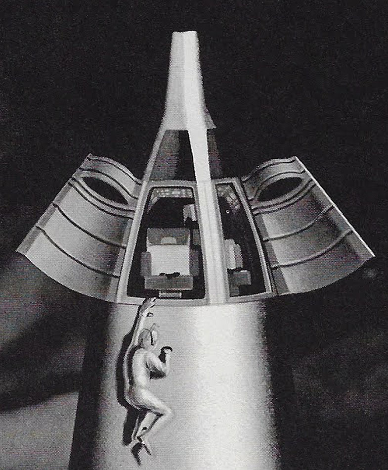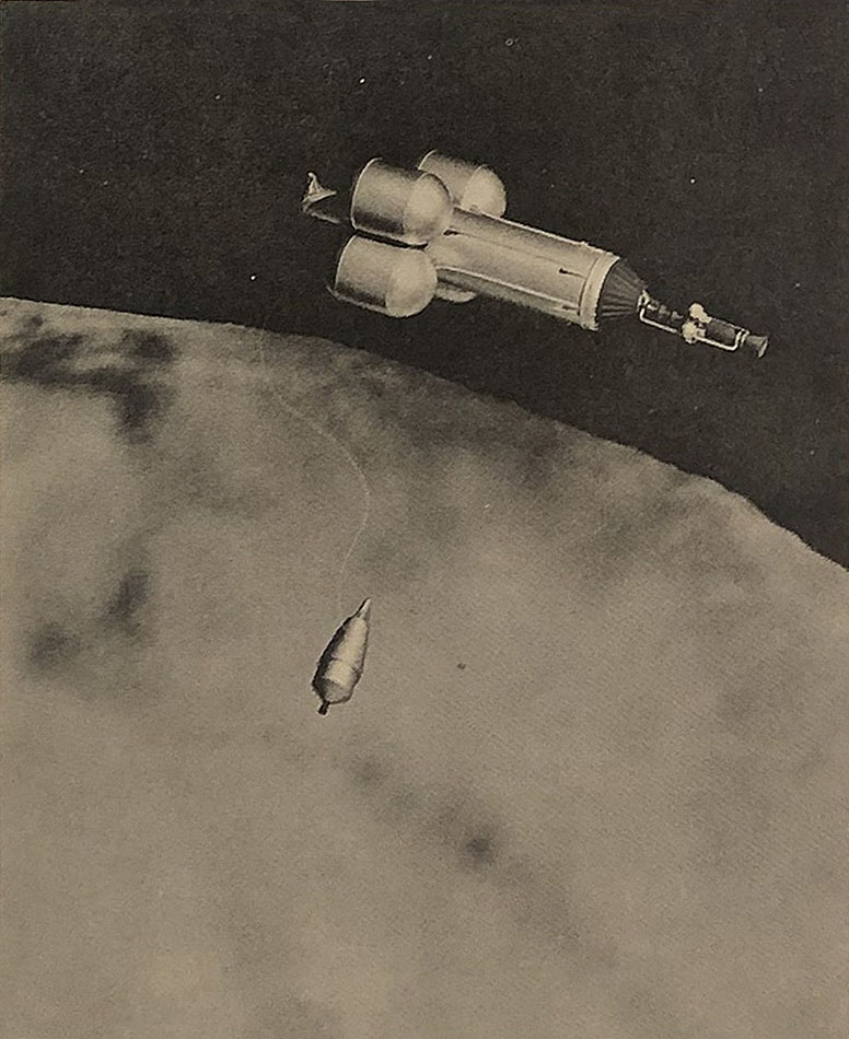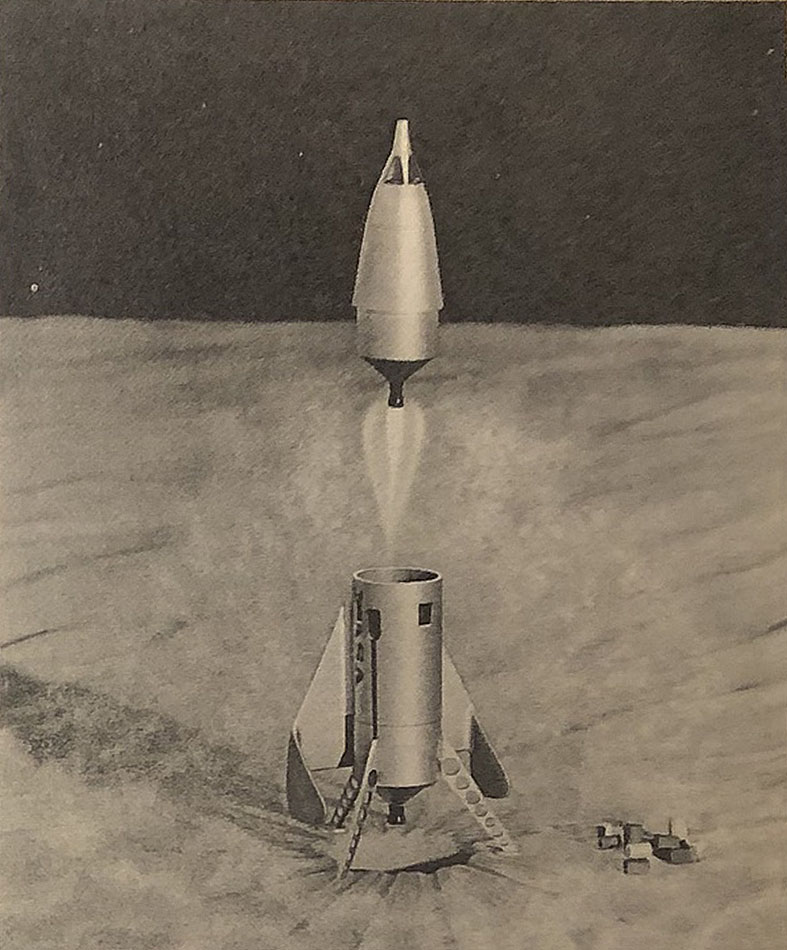 Обратите внимание, что спускаемый модуль напоминает «Dyno Soar», а его носовая часть двухместную капсулу «Gemini». Также на рисунке хорошо видно, что астронавты спускаются и поднимаются в носовую часть по скобам, прикреплённым к корпусу.