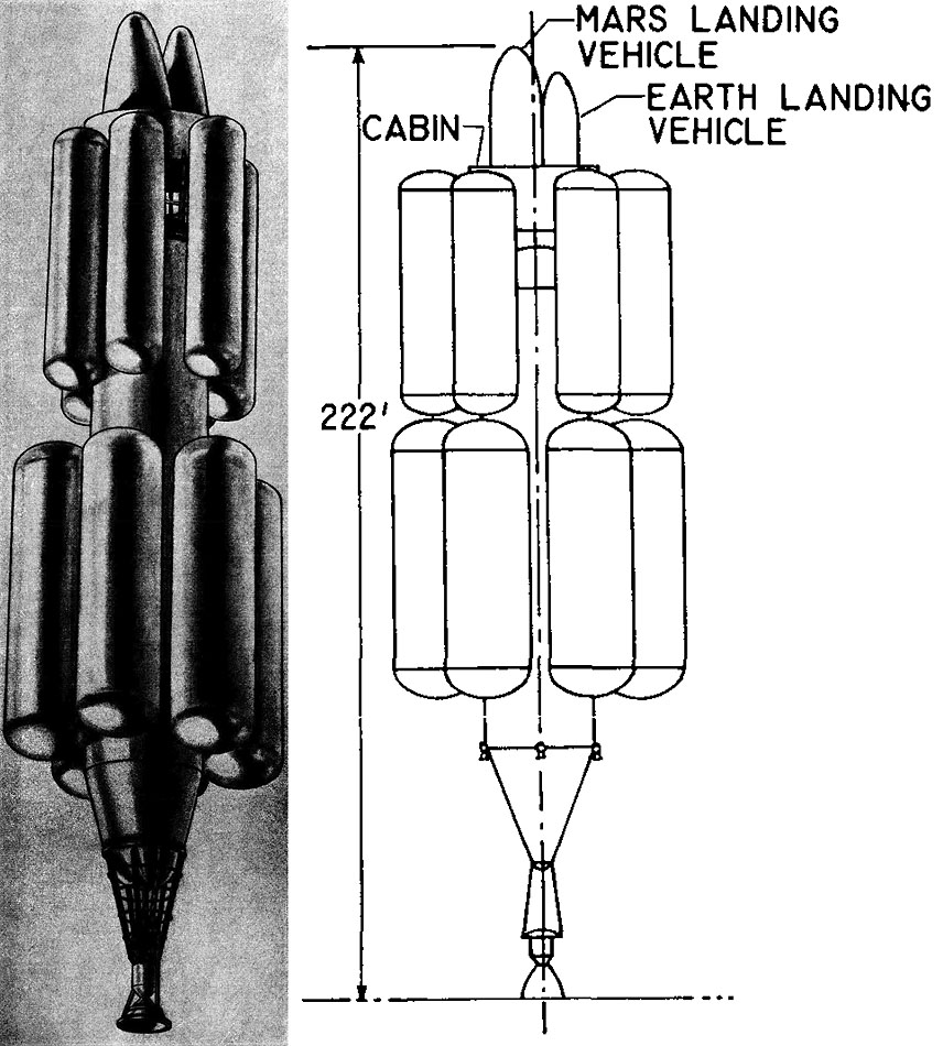 «Модуль двигательной установки и полезной нагрузки показан в стартовой конфигурации. Диаметр секции водородного бака и отсека экипажа составляет 22 фута. К переднему концу бака прикреплён модуль с химическим двигателем для посадки на Марс, который обеспечит высадку двух человек исследовательской группы после выхода космического корабля на марсианскую орбиту».