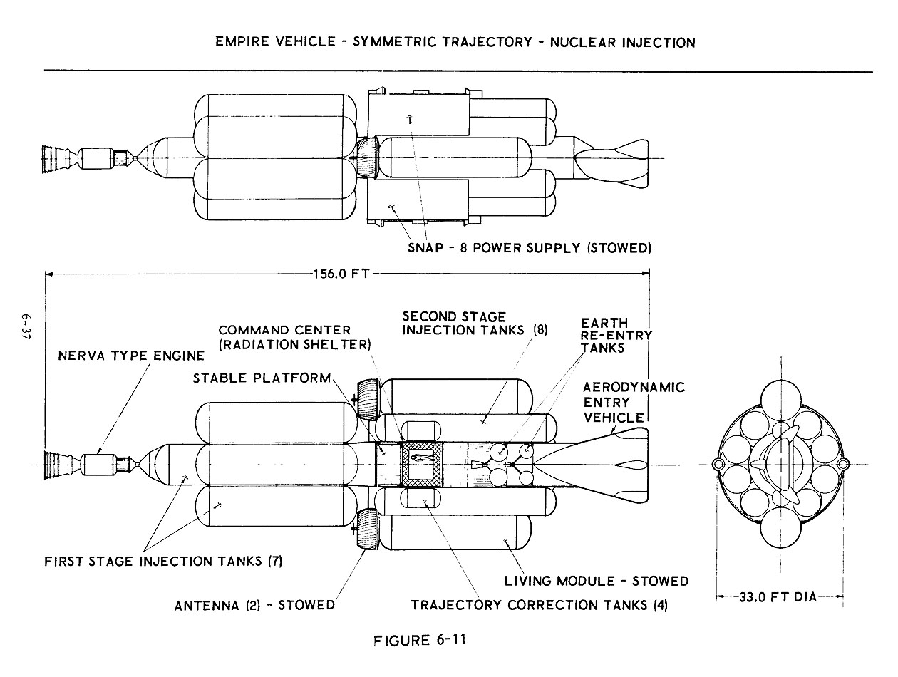 В 1961 году группа учёных из Исследовательского центра Льюиса, NASA, опубликовала статью «Исследование пилотируемой ядерно-ракетной миссии на Марс» (S. C. Himmel, J. F. Dugan, R. W. Luidens, R. J. Weber. A study of Manned Nuclear-Rocket Mission to Mars // Aerospace Engineering, July 1961, pp. 1819, 5158). Вверху показаны две иллюстрации из статьи, на которых изображена предполагаемая конфигурация космического корабля. Поясняющий текст: